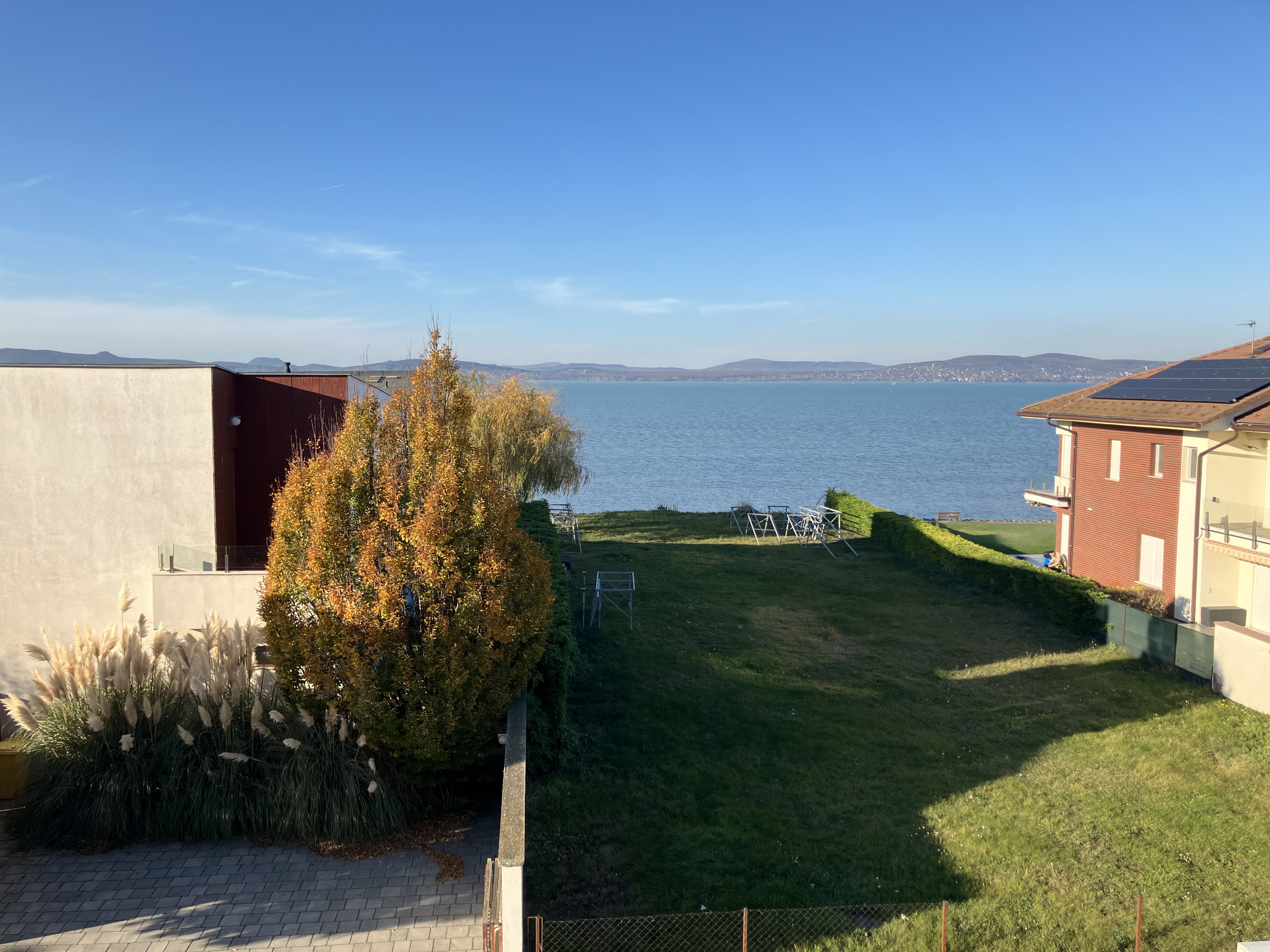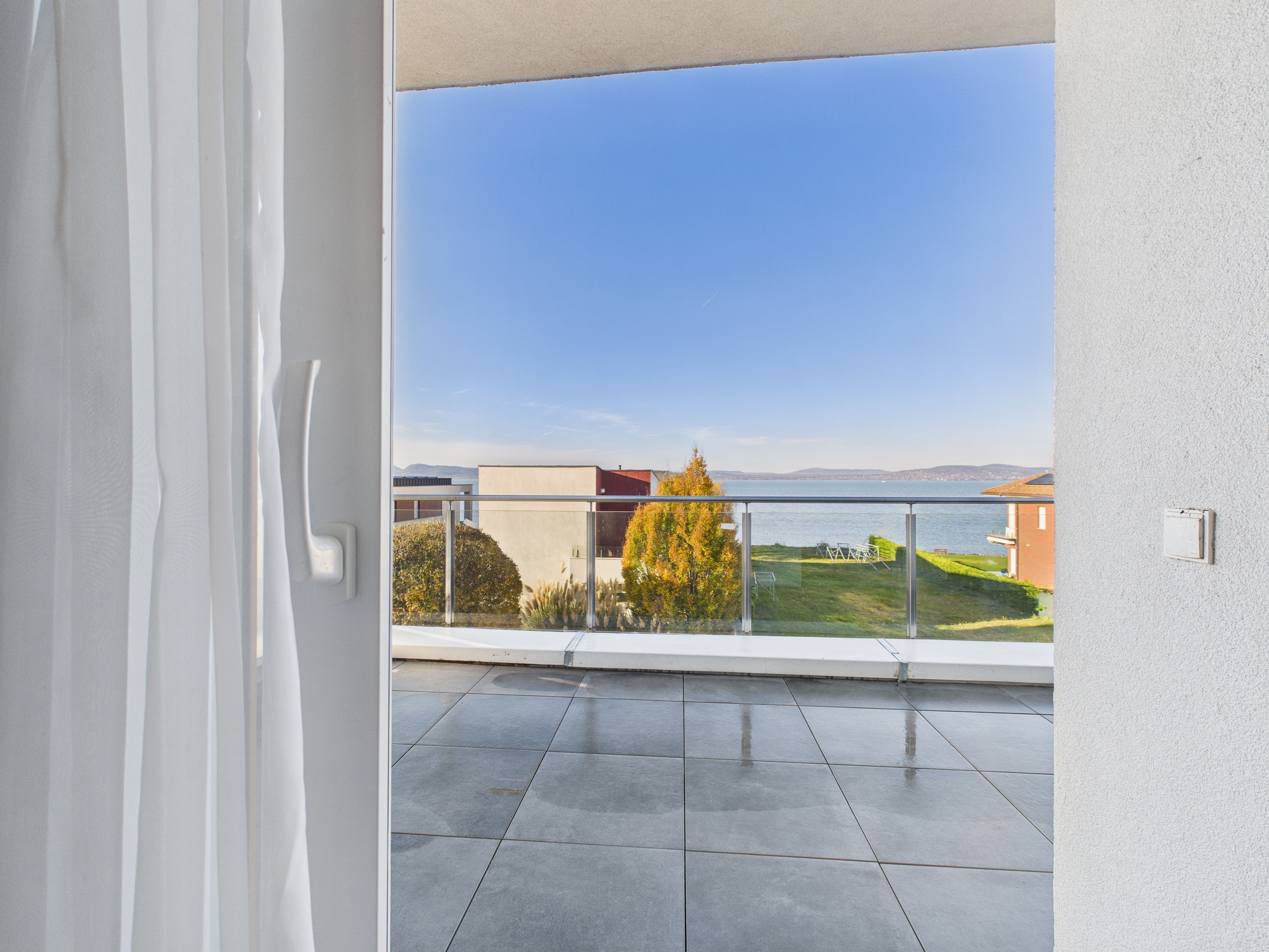 * A Balaton felé néző, nagy méretű terasz a lakás egyik legszebb része – napfelkeltéhez, vacsorához, pihenéshez, barátok fogadásához is tökéletes.