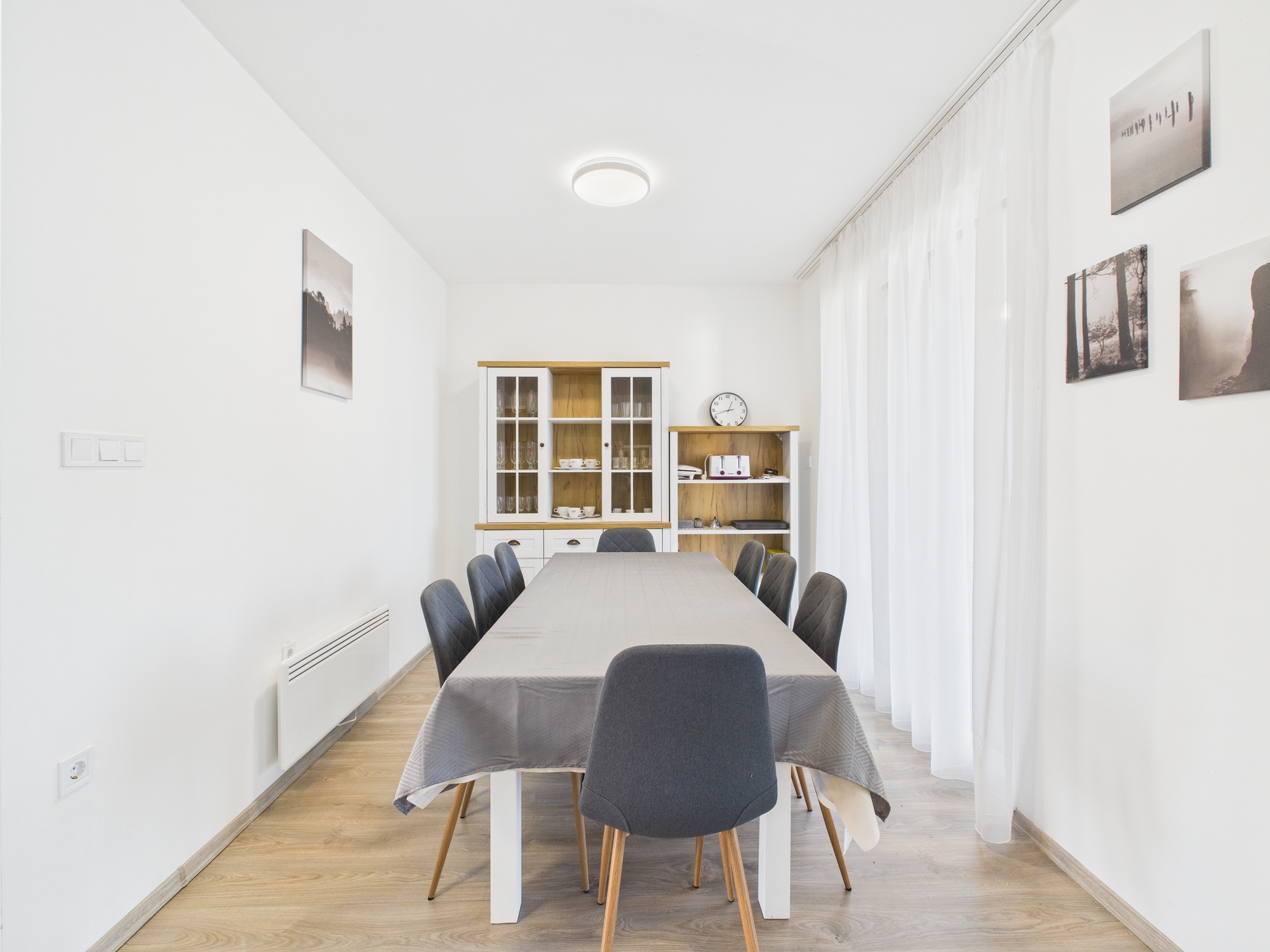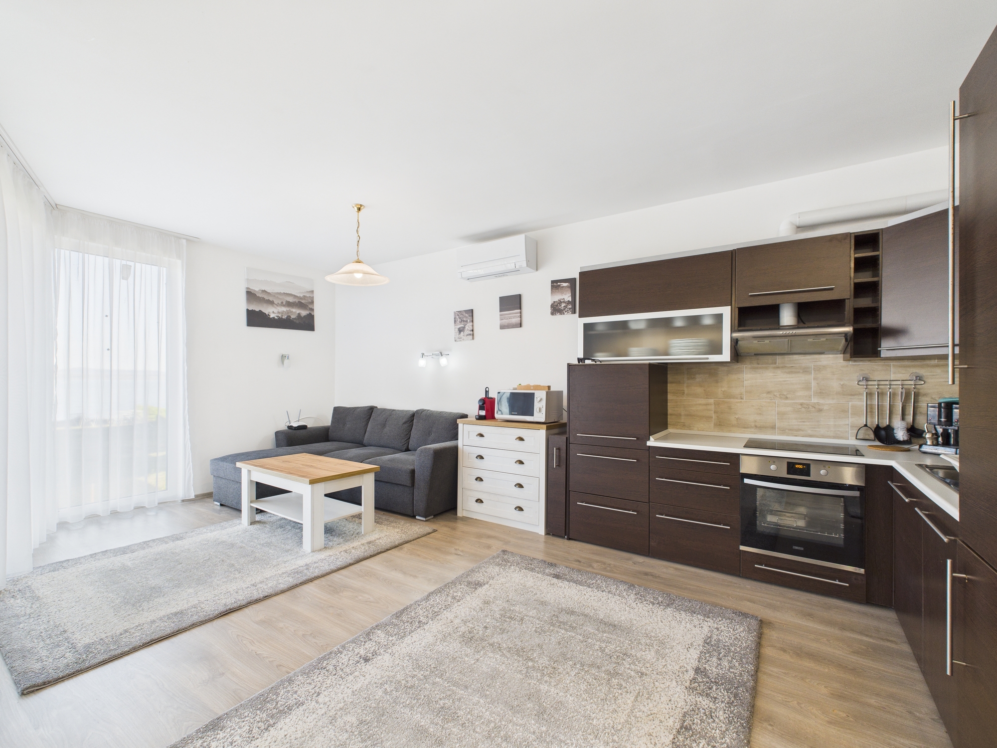 * Tágas, világos nappali–étkező–konyha egy légtérben, amely természetes központja a lakásnak.