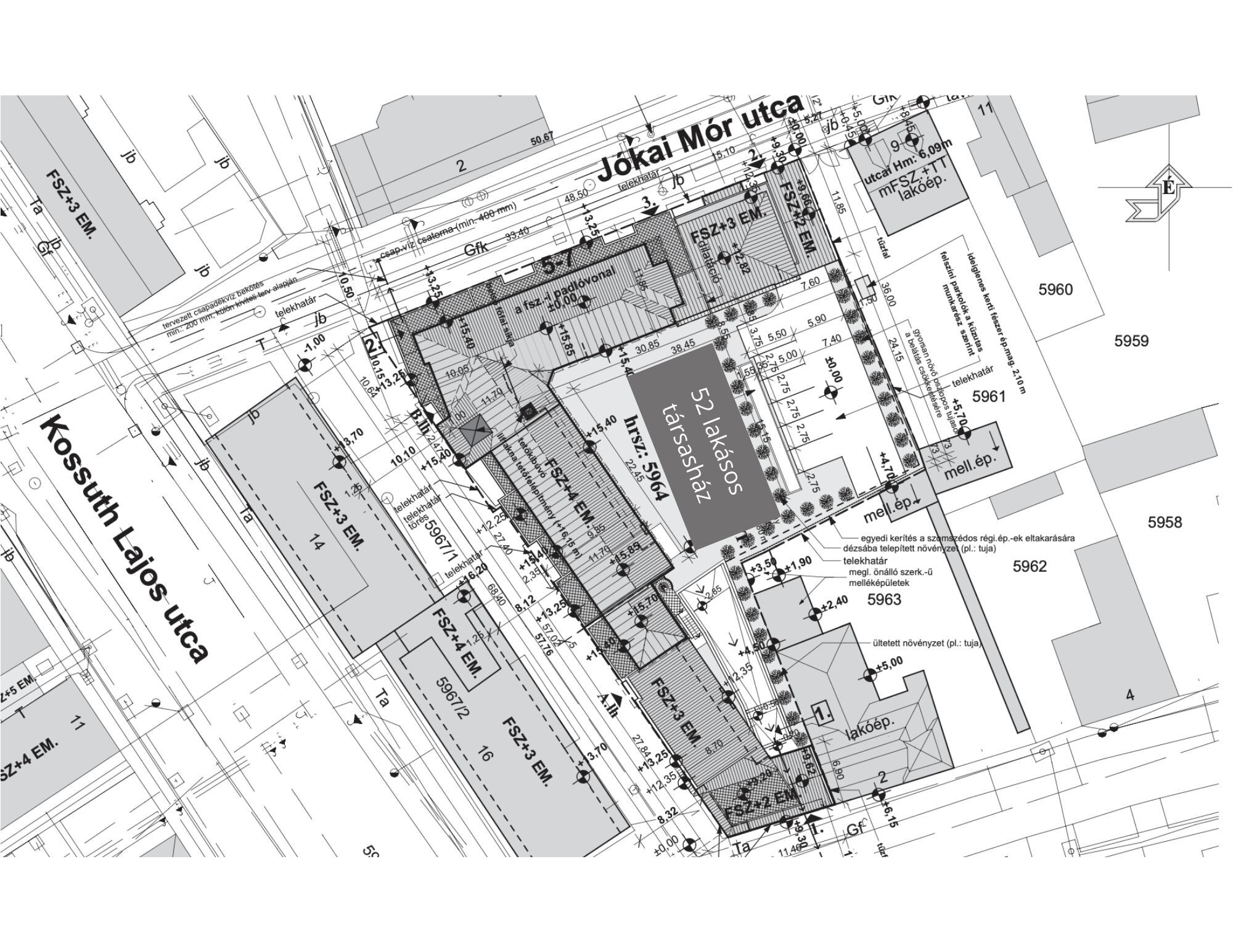 Az engedélynek megfelelően a telekre egy pinceszint + földszint + 4 emeletes, 12,98 m építménymagasságú, összesen 4954,45 m² hasznos alapterületű épület építhető, amely 52 lakást, 4 üzlethelyiséget, minden lakáshoz teremgarázst és egy liftet foglal magába. A zártsorúan elhelyezendő épület 1196,40 m² beépített alapterülettel rendelkezik, a modern városi élet igényeit maximálisan kielégítve.