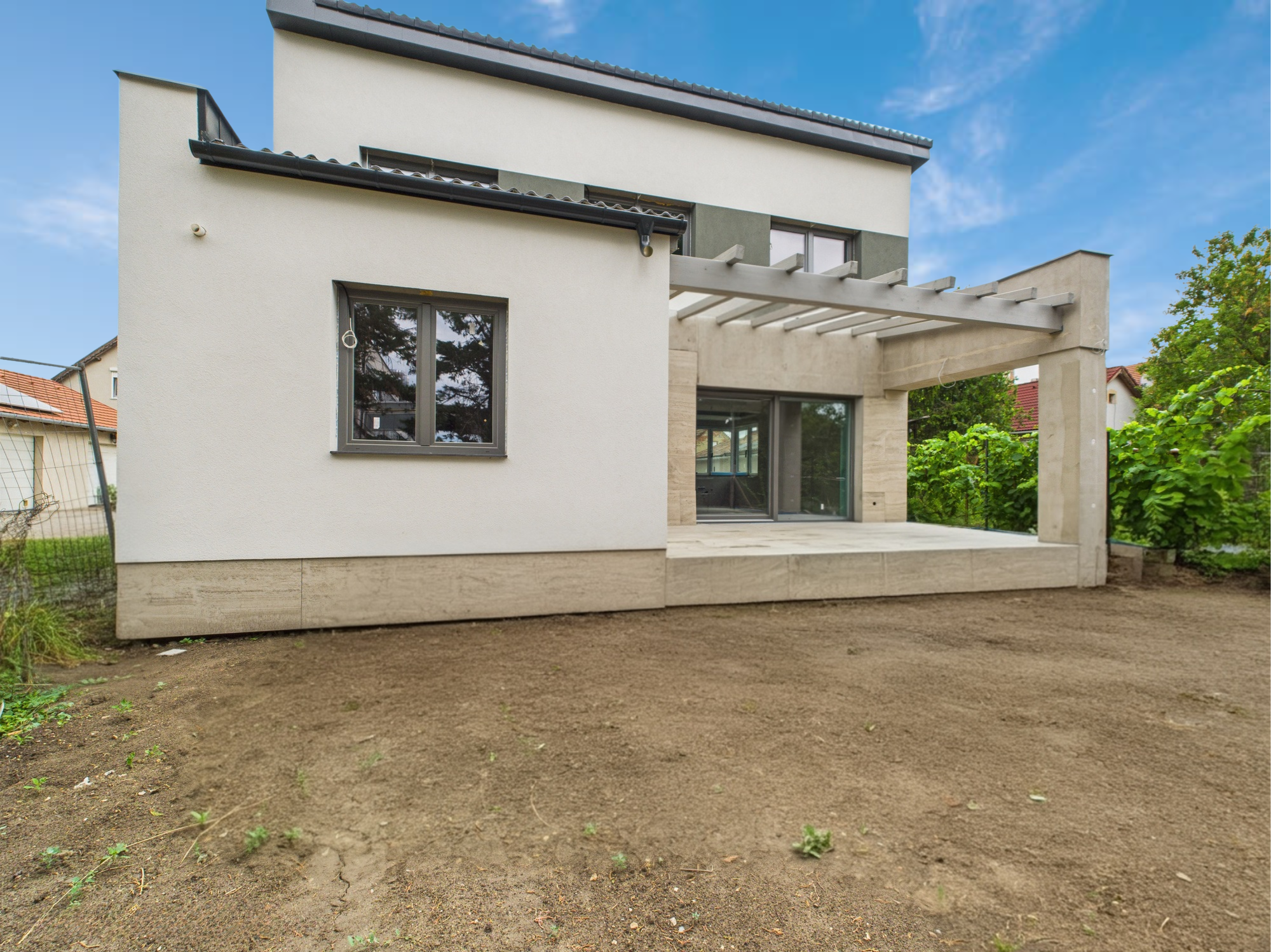 * Kiemelkedő műszaki tartalom: levegő‑víz hőszivattyú, padlófűtés és mennyezeti hűtés‑fűtés, 5 kW teljes rendszerű napelem, elektromos redőnyök – mind az irányárban